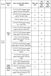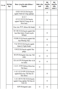 ※ 예체능: 예술체육대학(Khoa Nghệ thuật và Giáo dục thể chất), 연기학과( Khoa diễn xuất),미디어영상학과 (Khoa truyền thông và hình ảnh) và 애니메이션학과(Khoa phim hoạt hình)