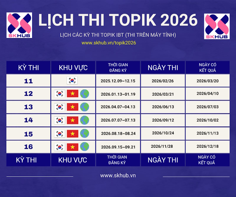 Thông thường, thời gian đăng ký thi tại Việt Nam sẽ có sớm hơn so với ở Hàn Quốc. Vì vậy, hãy chú ý theo dõi bài viết về thi TOPIK tại website skhub.vn hoặc fanpage facebook.com/duhocskhub để cập nhật chính xác nhất.